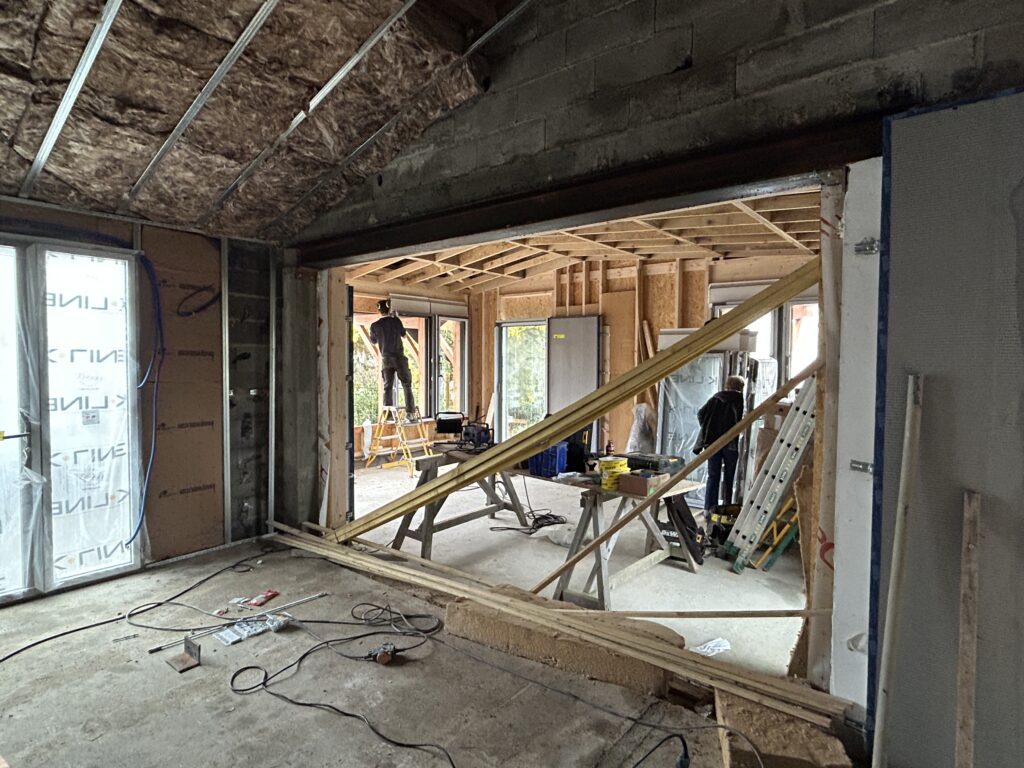 Les démolitions se poursuivent, les frangements réalisés, les cheminées démolies et la couverture du RDC haut est découverte faisant apparaître la volige d’origine :